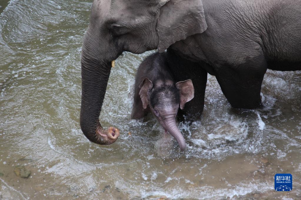 1月15日,在云南西雙版納野象谷,一頭新生小象在象媽媽的庇護下戲水。