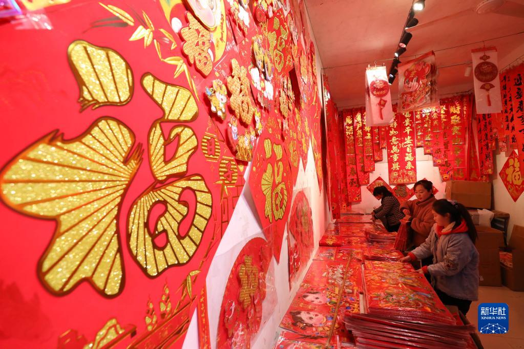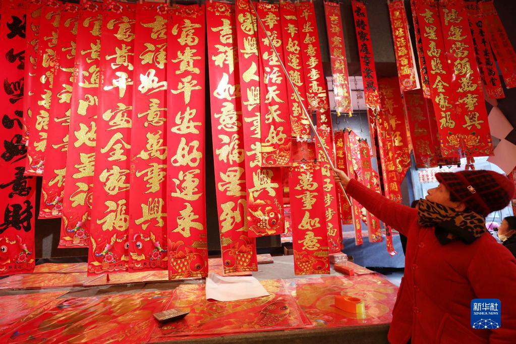 1月25日,河南省焦作市溫縣趙堡鎮趙堡村年貨市場一家店鋪的店主在整理春聯。