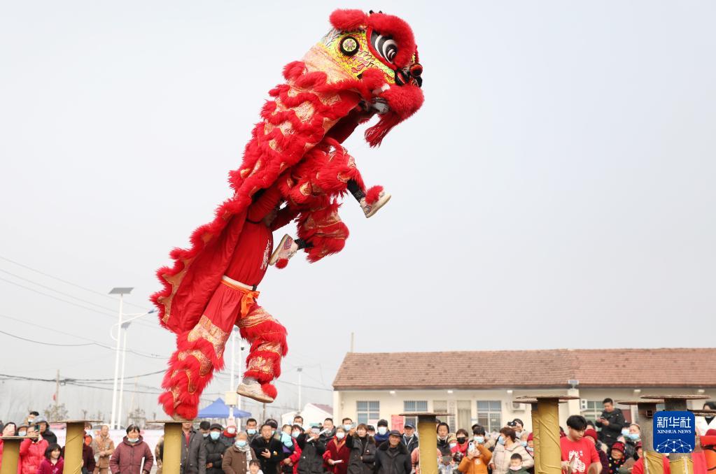 1月25日,在安徽省淮北市烈山區古饒鎮南園村,村民在觀看舞獅表演。