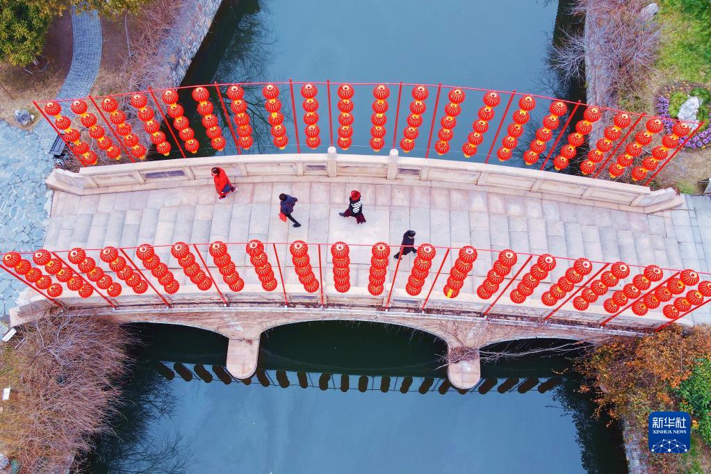 1月25日,市民在江蘇省如皋市水繪園風景區游玩(無人機照片)。