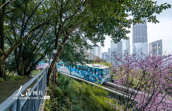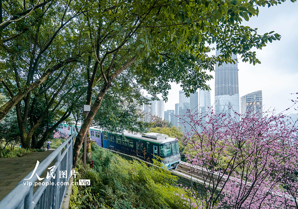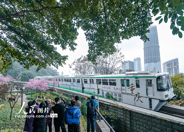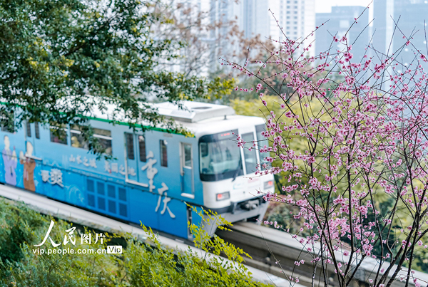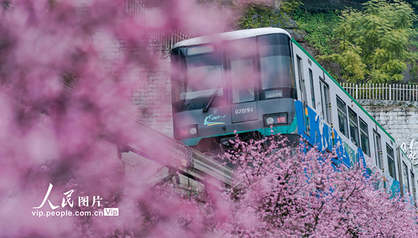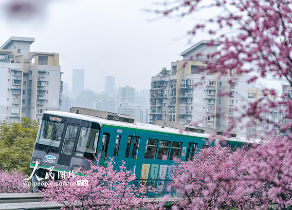 2022年2月20日,重慶市軌道交通二號線佛圖關段的美人梅迎春綻放,列車穿行花海,猶如開往春天的列車。李洪波攝(人民圖片網)