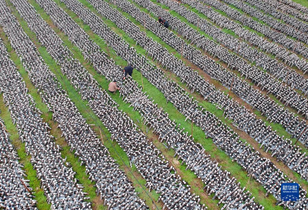 2月23日,在福建省南平市建陽區(qū)徐市鎮(zhèn)北岸村的大風(fēng)車食用菌農(nóng)產(chǎn)品采摘基地,農(nóng)戶在黑木耳種植田間作業(yè)(無人機(jī)照片)。