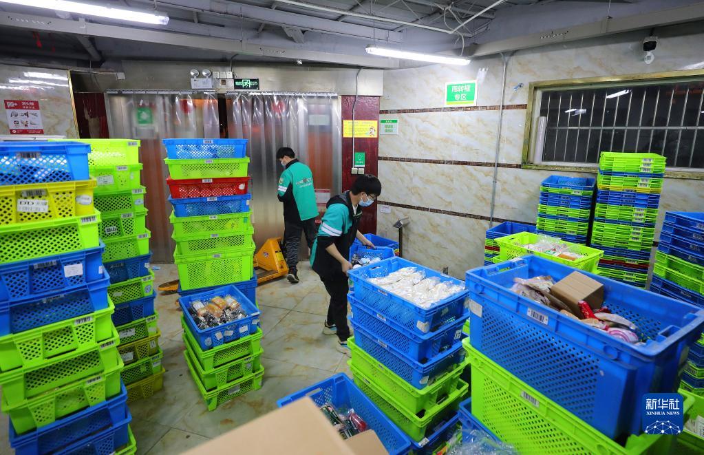 3月15日深夜,在位于上海閔行區(qū)老滬閔路的一家網絡購物平臺倉配站點,工作人員將一批生鮮肉制品放入冷藏柜。