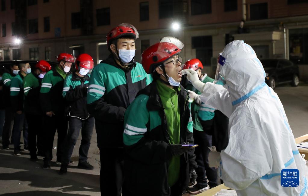 3月15日,在位于上海閔行區(qū)的一家網絡購物平臺倉配站點外,結束一天工作的配送騎手在進行核酸檢測。