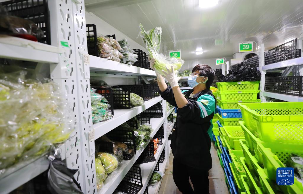 3月15日深夜,在位于上海閔行區(qū)老滬閔路的一家網絡購物平臺倉配站點,工作人員在冷藏庫內將新到貨的蔬菜分類擺放到貨架上。