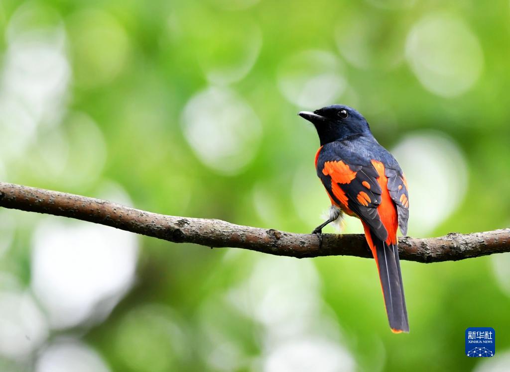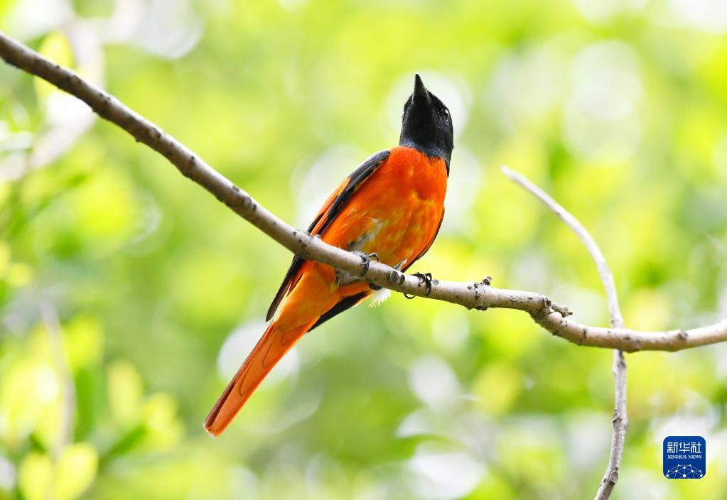 在福州金雞山公園,一只赤紅山椒鳥在樹枝上停留(3月29日攝)。