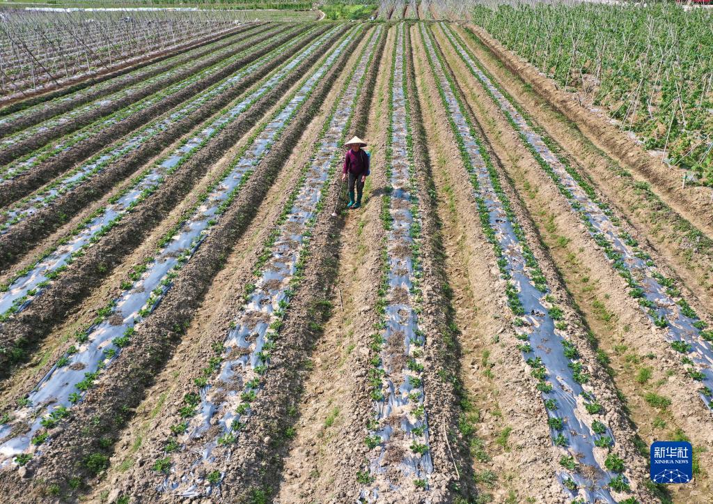 4月6日,村民在廣西南寧市興寧區(qū)五塘鎮(zhèn)的田間管護(hù)作物(無人機(jī)照片)。