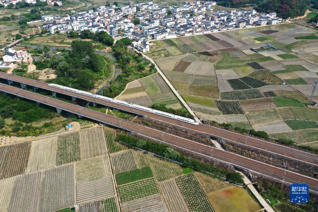 4月6日,一列火車駛過廣西南寧市興寧區(qū)五塘鎮(zhèn)的田園(無人機(jī)照片)。